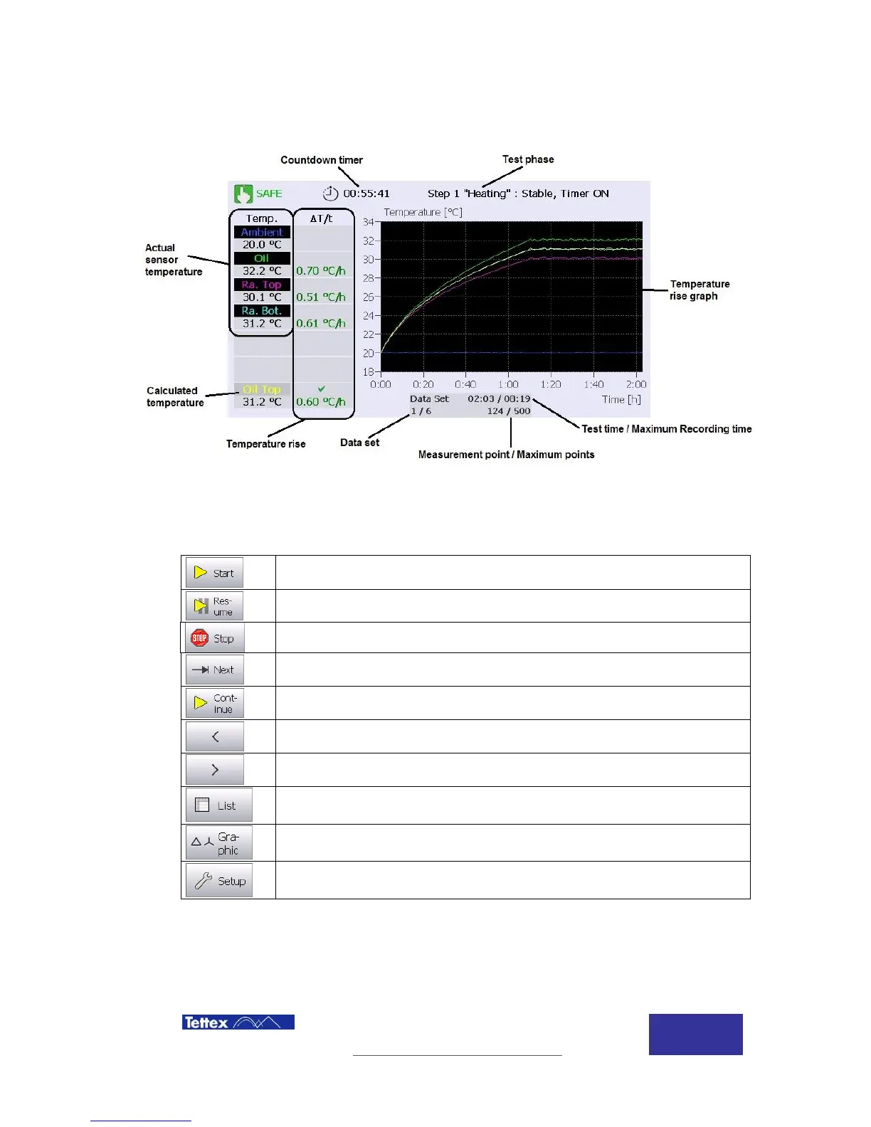 While in temperature rise application, following actions are available in the button key bar. The