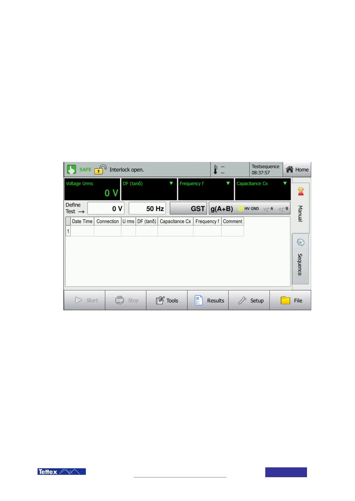 parameters are defined, then high voltage is turned on and a measurement value is recorded. The manual tab