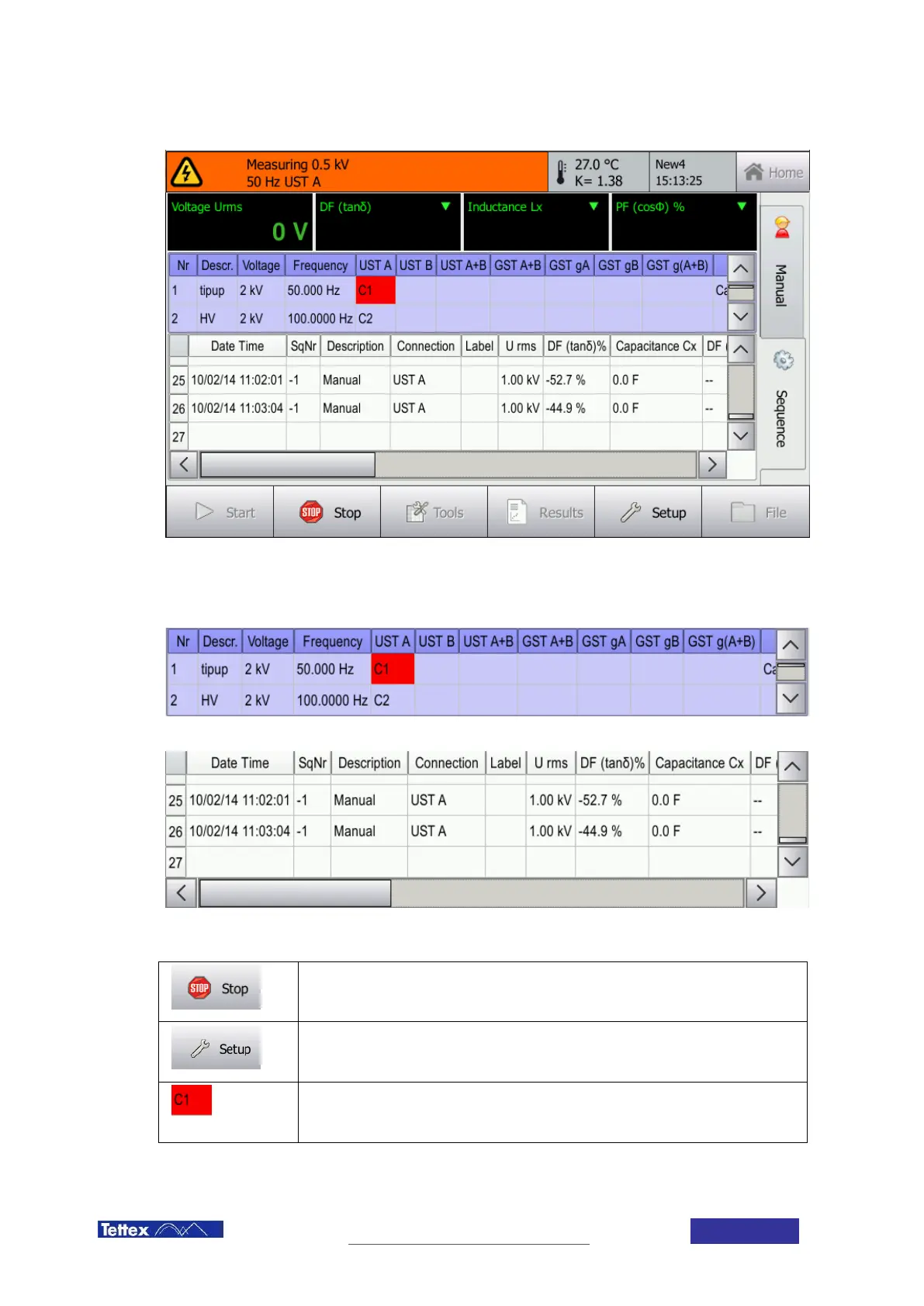 and in the bottom the measurement results. A red indicator marks the sequence step currently measured. The
