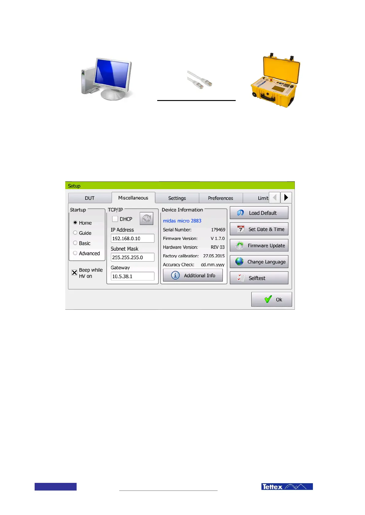 You can find the IP address configuration of your device in the “Setup” – “Miscellaneous” dialog: