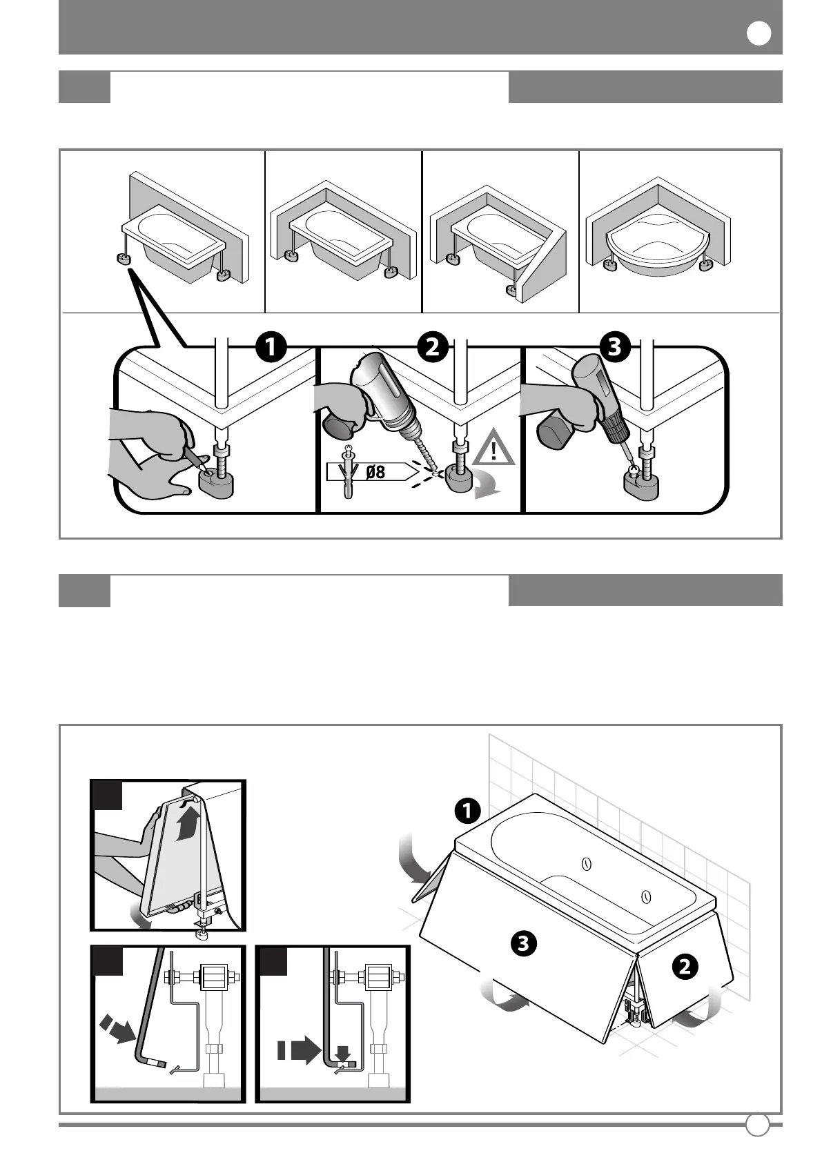 Anchor the bathtub to the floor by fixing the feet as indicated in the drawing, using the screws and masonry plugs provided.