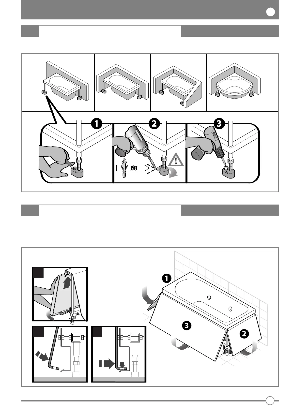 Zamocować wannę do podłoża na nóżkach zgodnie ze wskazaniami na projekcie stosując załączone śruby