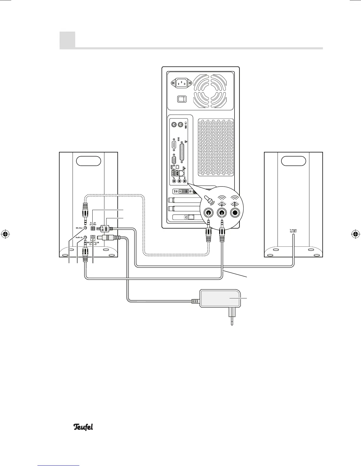 1. Insert the plug of the connector cable (9) in the jack (6) of the right speaker.