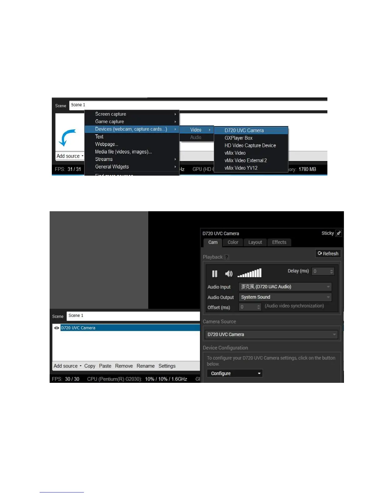 (2) Sources (or Add) Webcam, capture card, video devices D720 UVC