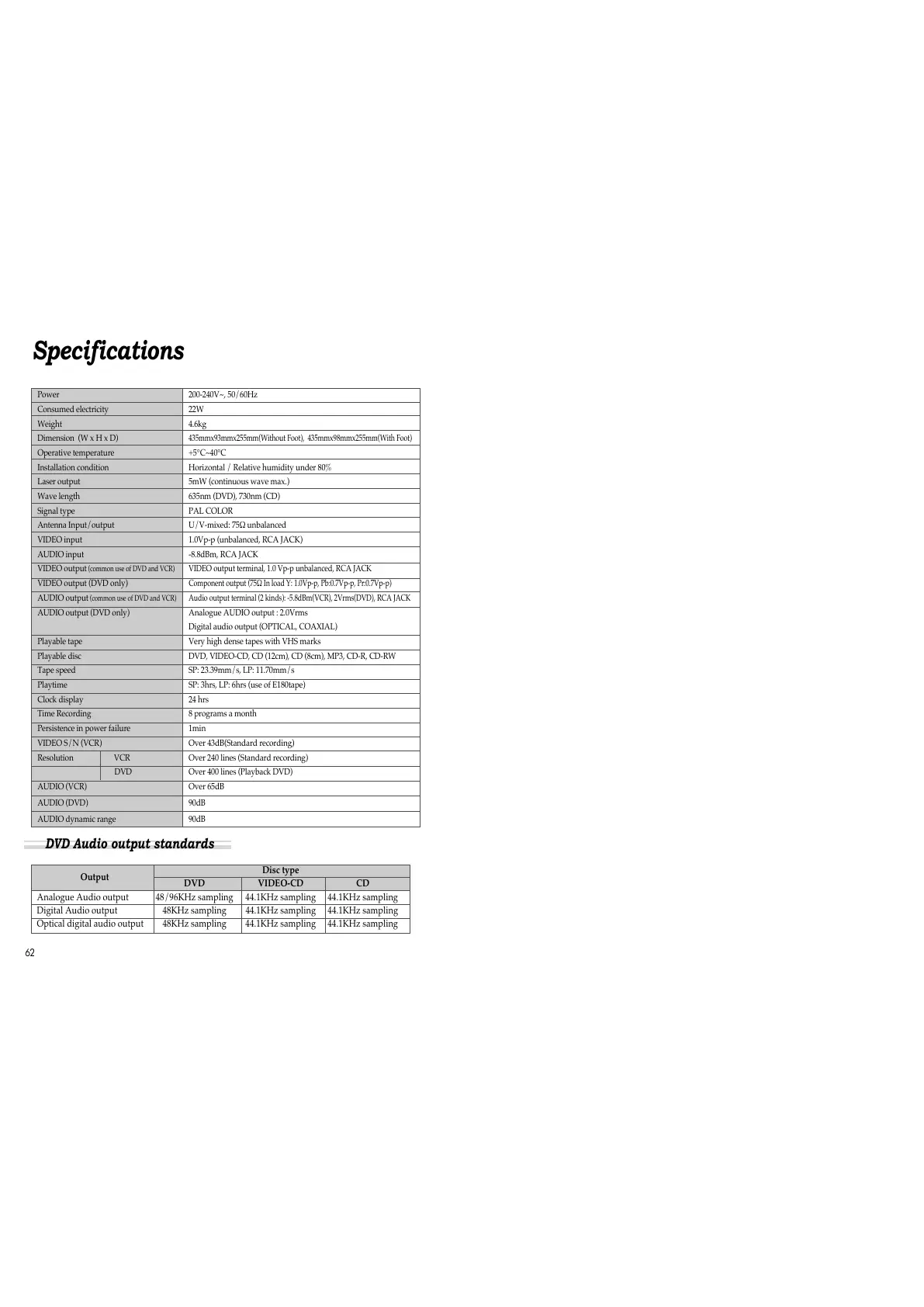 (common use of DVD and VCR) Audio output terminal (2 kinds): -5.8dBm(VCR), 2Vrms(DVD), RCA JACK