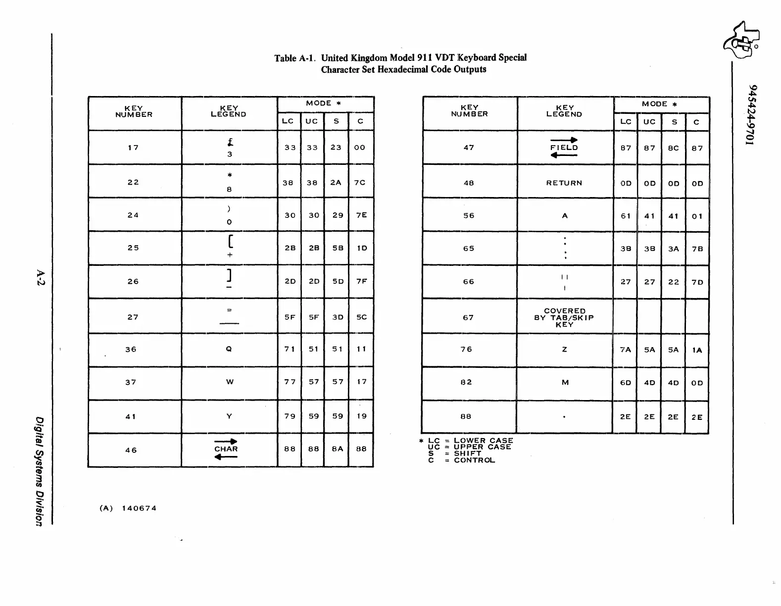 Table A-1. United Kingdom Model 911 VDT Keyboard Special