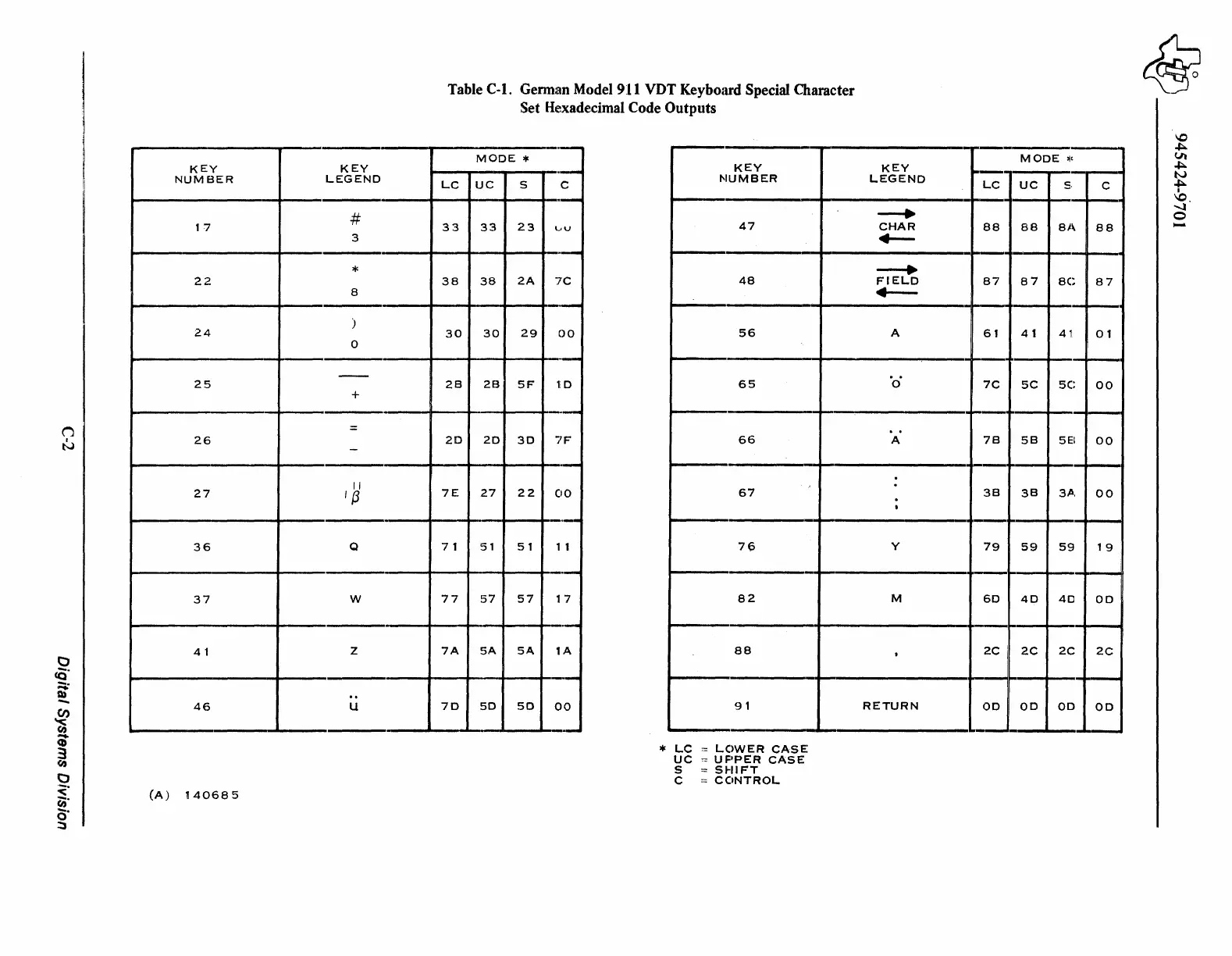 Table C-1. German Model 911 VDT Keyboard Special Character