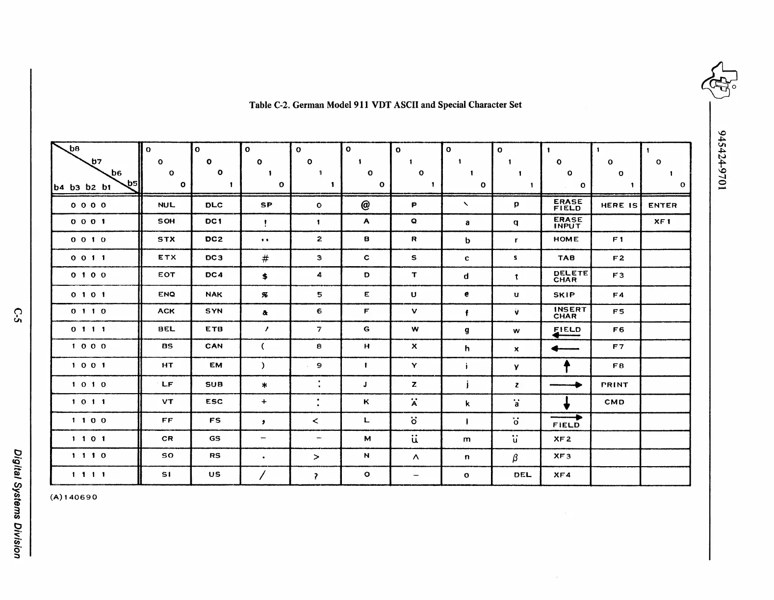 Table C-2. German Model 911 VDT ASCII and Special Character Set