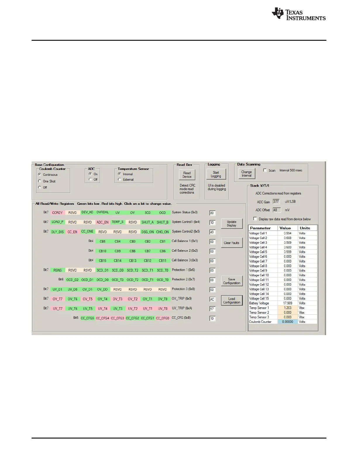 bq76940/bq76930/bq76920 software and the IC. The software reads the factory gain and offset data from