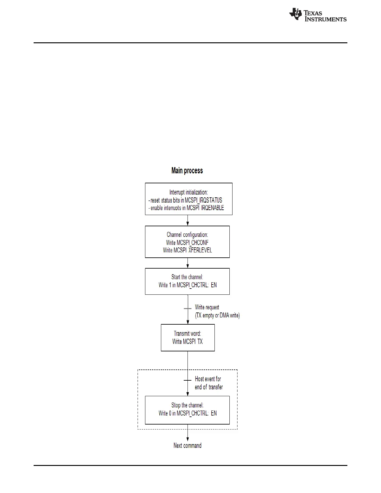 The sequence varies according to whether word count is used or not (SPI_XFERLEVEL : WCNT ≠ 0 or