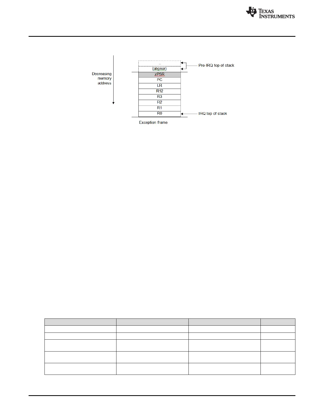 handler start address from the vector table. When stacking is complete, the processor starts executing the