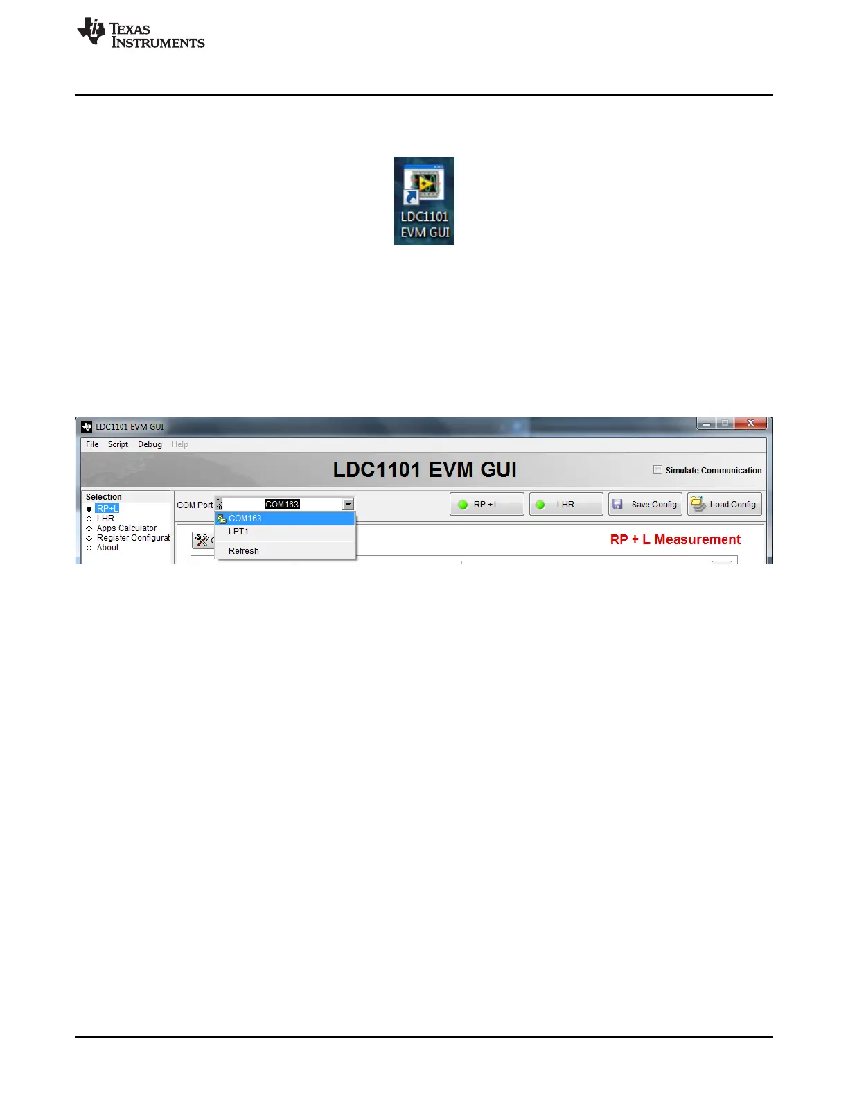 The LDC1101GUI uses a virtual COM port to communicate with the LDC1101EVM through USB.
