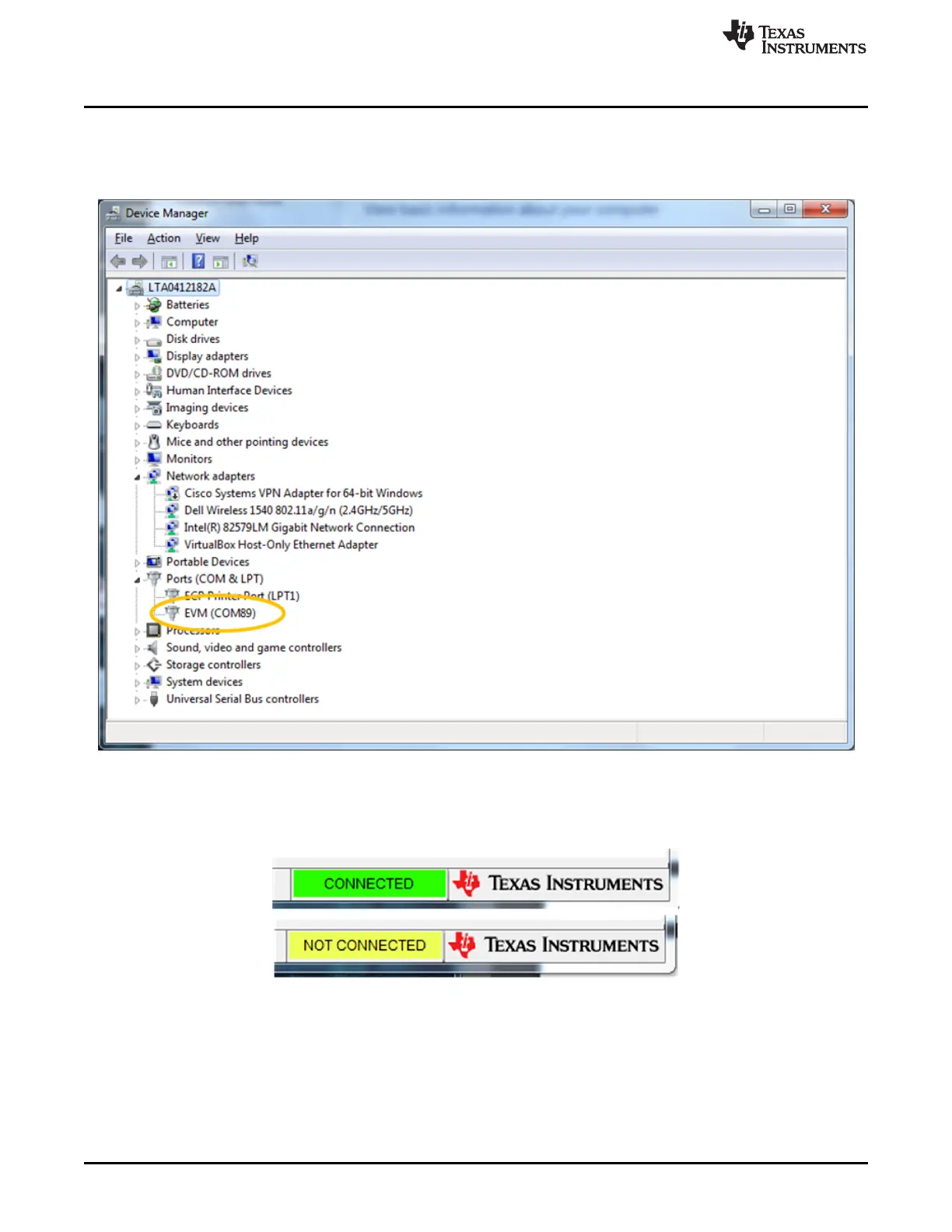 assigned to the EVM. To determine the correct COM port, open the Windows Device Manager and find