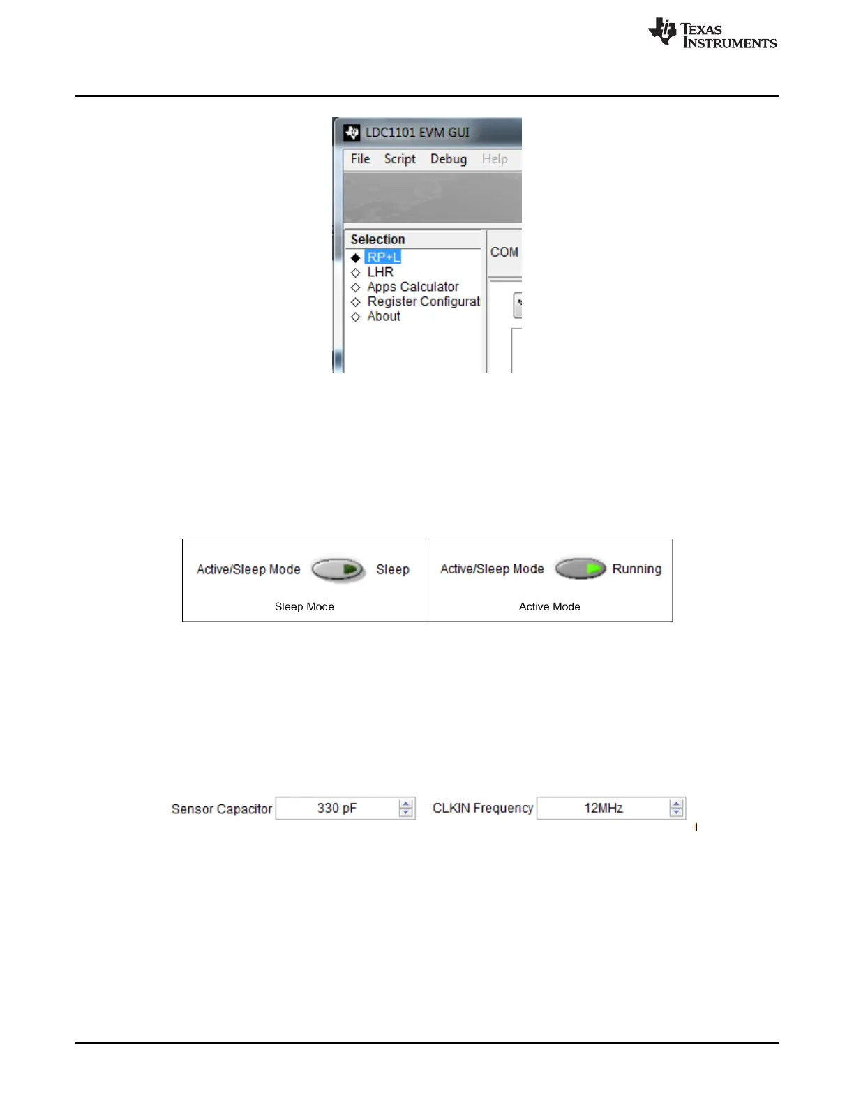 The Active/Sleep Mode control changes the operating mode of the LDC1101; pressing the button toggles