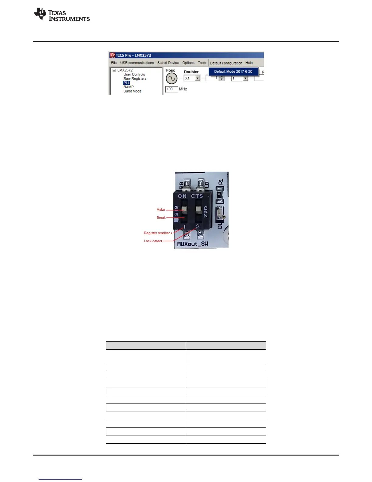 To read back register in TICS Pro, set Switch 2 to the Break position.