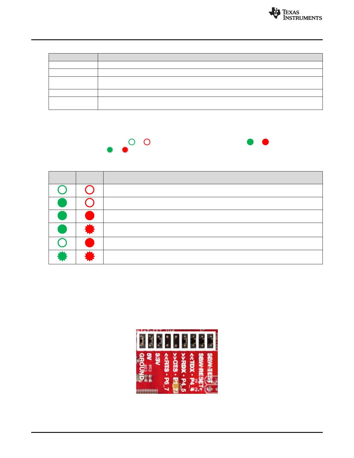 eZ-FET emulators show their operating states using two LEDs, one green and one red. Table 11 lists all