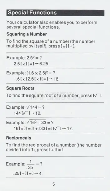 Texas Instruments TI-1795 - Special Functions; Squaring a Number; Square Roots; Reciprocals