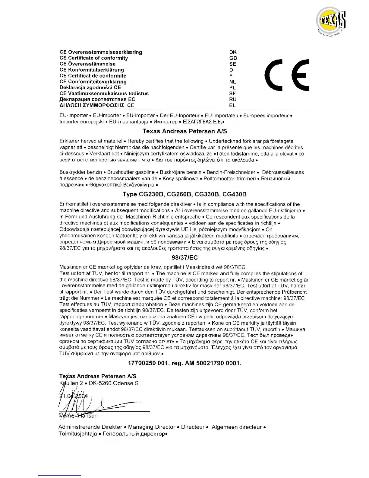 Texas CG230B - CE Erkæring; Ce Överensstämmelse; Certificat de Conformité CE; CE Certificate of Conformity