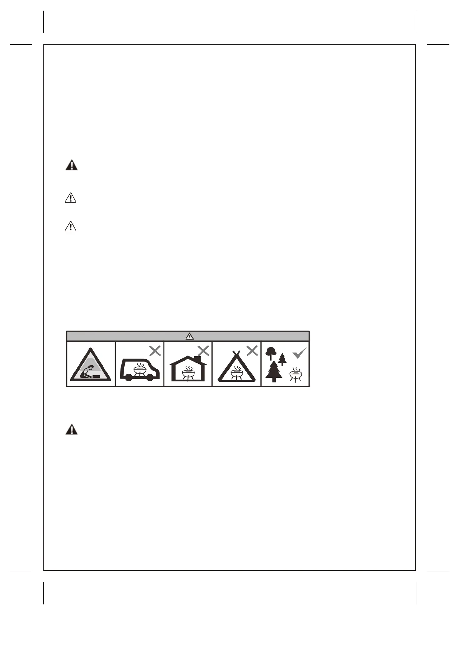 Do not use the barbecue in a confined and/or habitable space, e.g. houses, tents, caravans, motor homes or boats. Danger of carbon