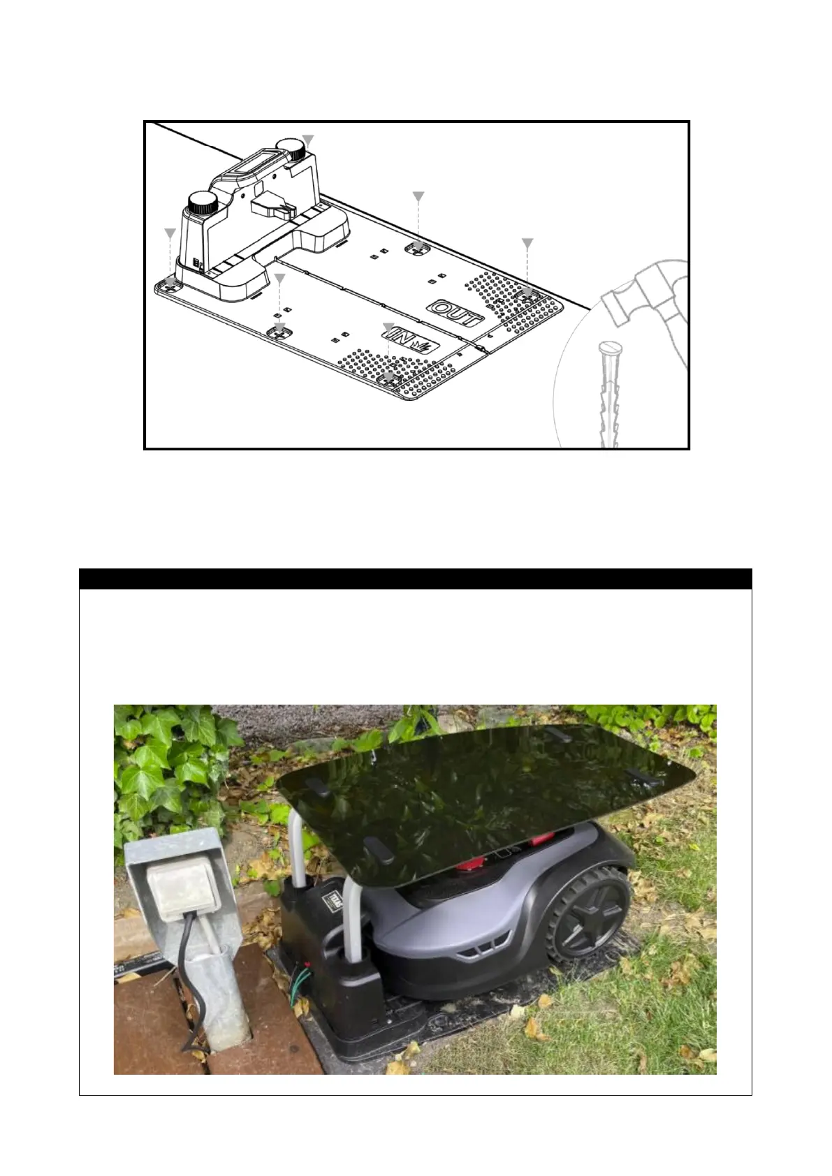 Assurez-vous que la zone "OUT" est orientée vers le bord de la pelouse.