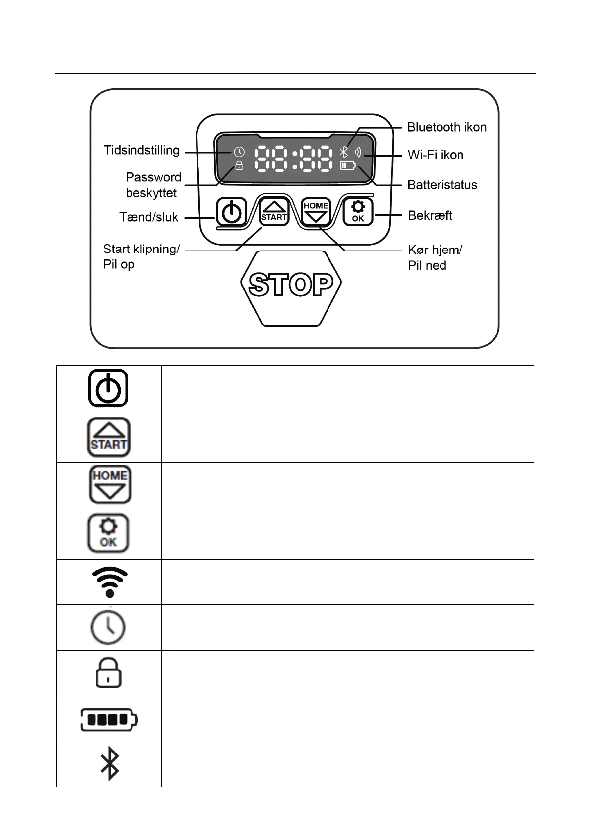 Start Knap: Robotplæneklipperen vil starte dens klippecyklus når