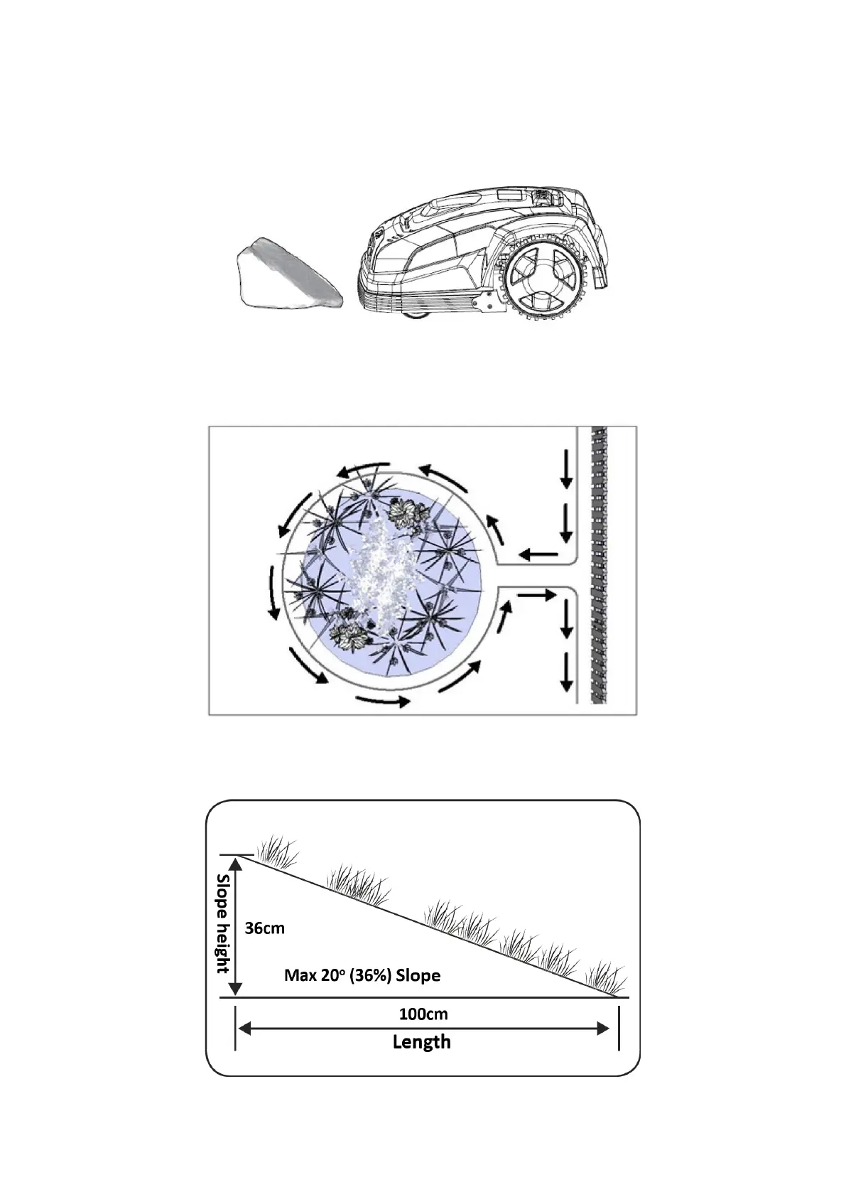 The robot lawn mower can drive up and down slopes with a maximum gradient of 20°.