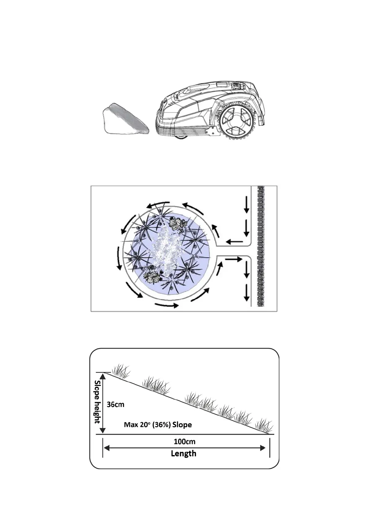 The robot lawn mower can drive up and down slopes with a maximum gradient of 20°.