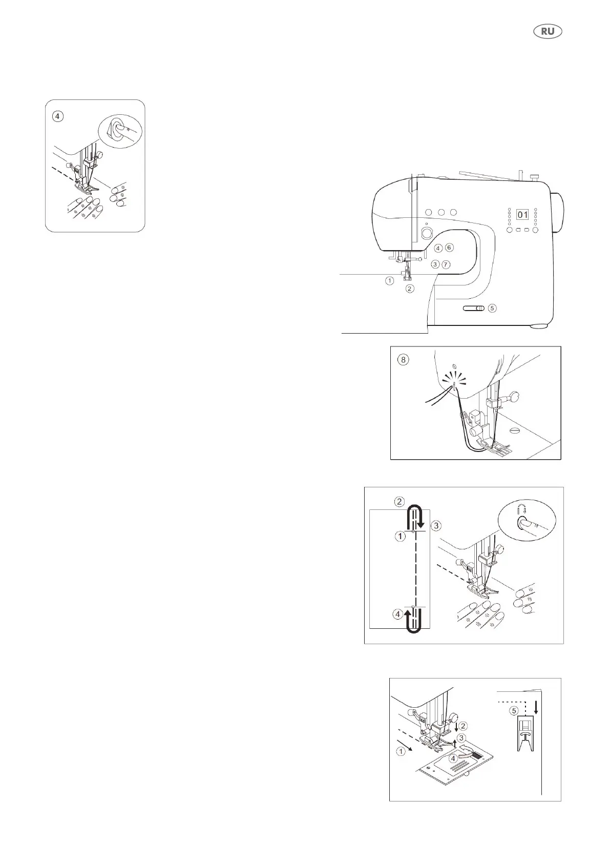 4. Отведите игольную и шпульную нити назад.Прошейте