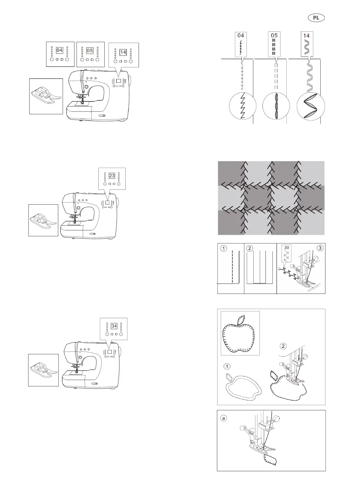 Opuść igłę i podnieś stopkę. Wykonuj obroty na igle by obszywać łuki.