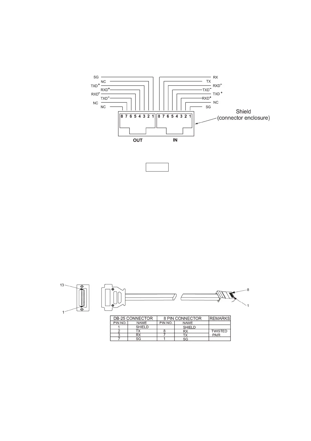 connectors. The connectors are 8 contact RJ-45. The IN and OUT connectors are used to connect