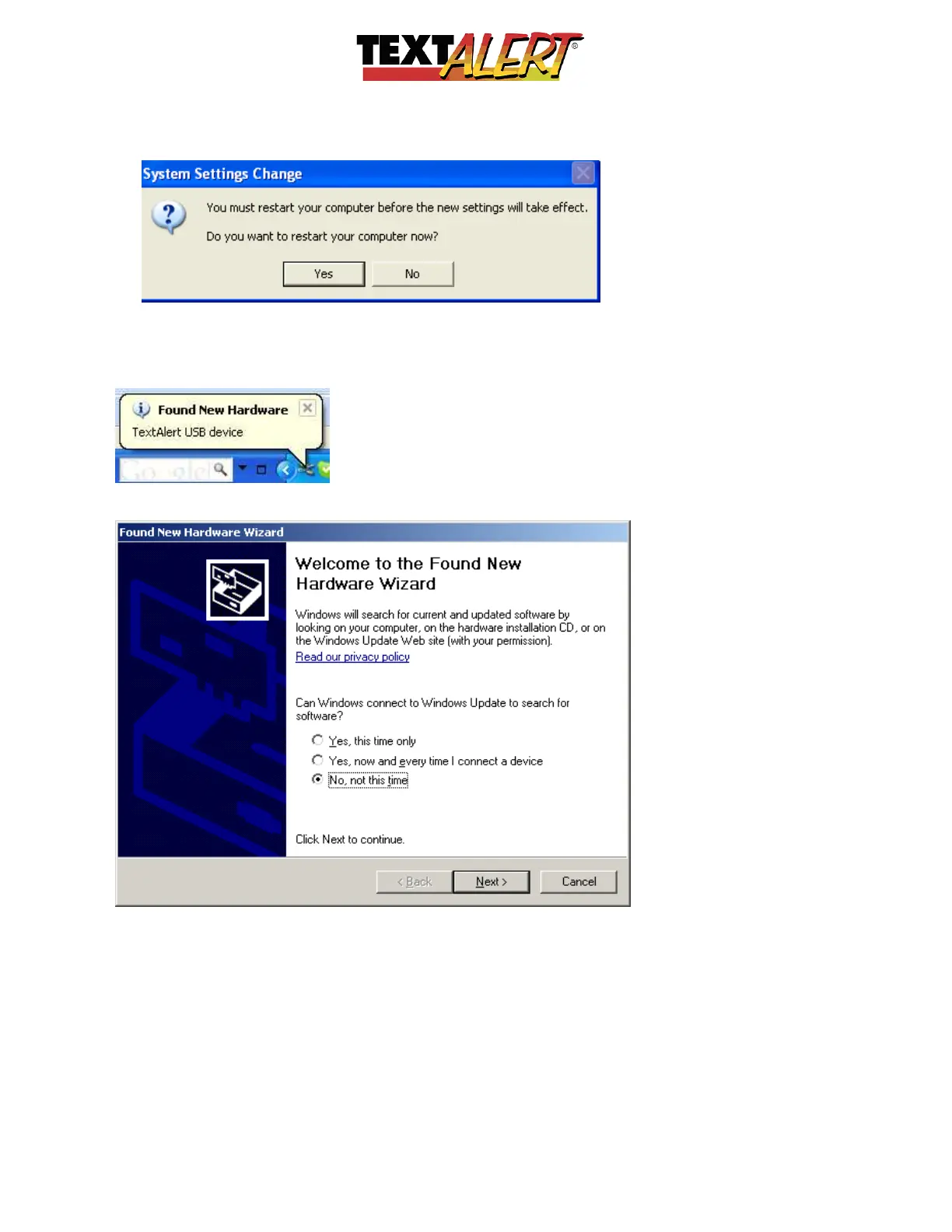 After the PC has restarted, you can connect your TextAlert to the PC using the USB cable and