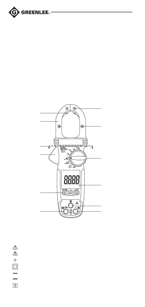 2. Jaw center indicator for best current accuracy; polarity indicator for DC amps