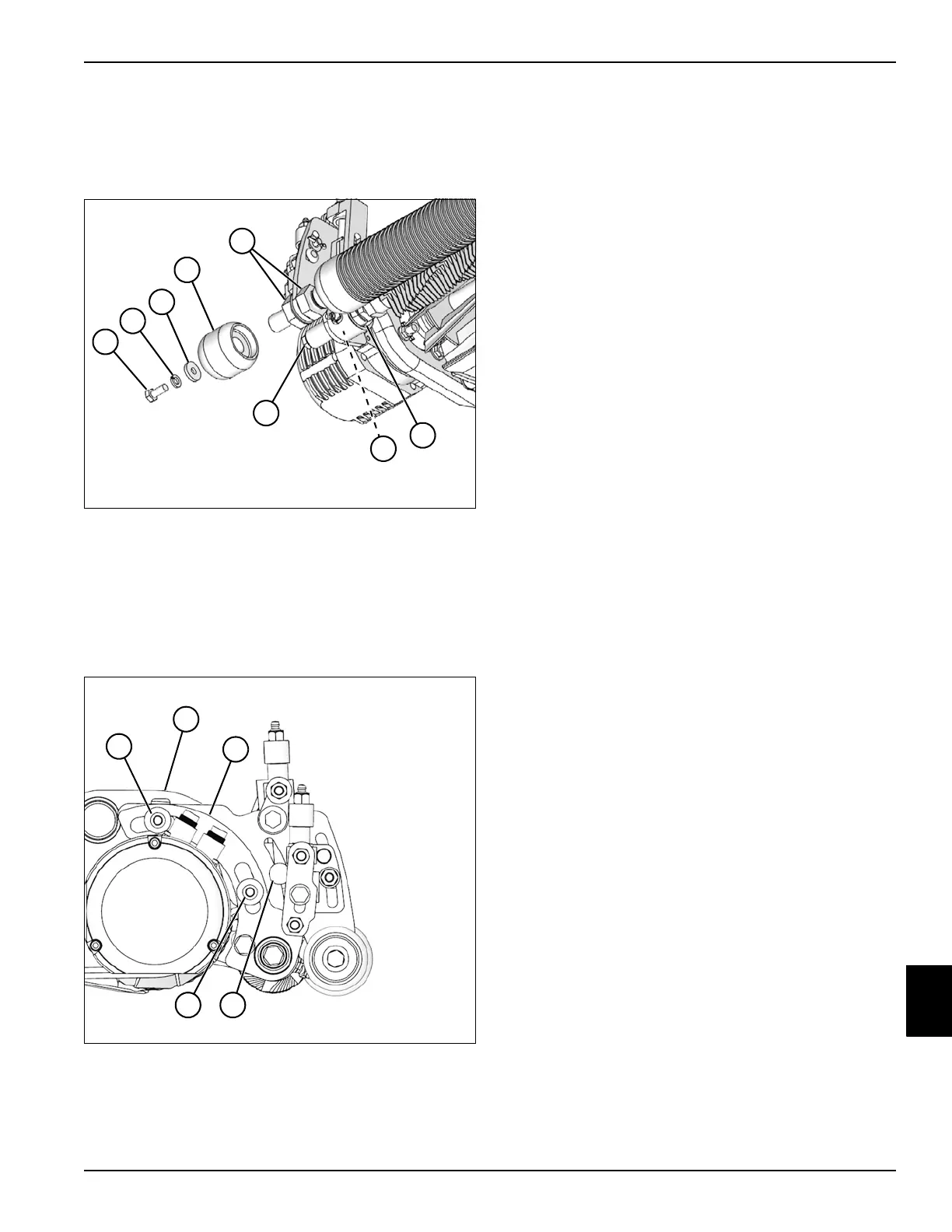 3. Loosen turf groomer lock nut (8), shaft screw (6), and
