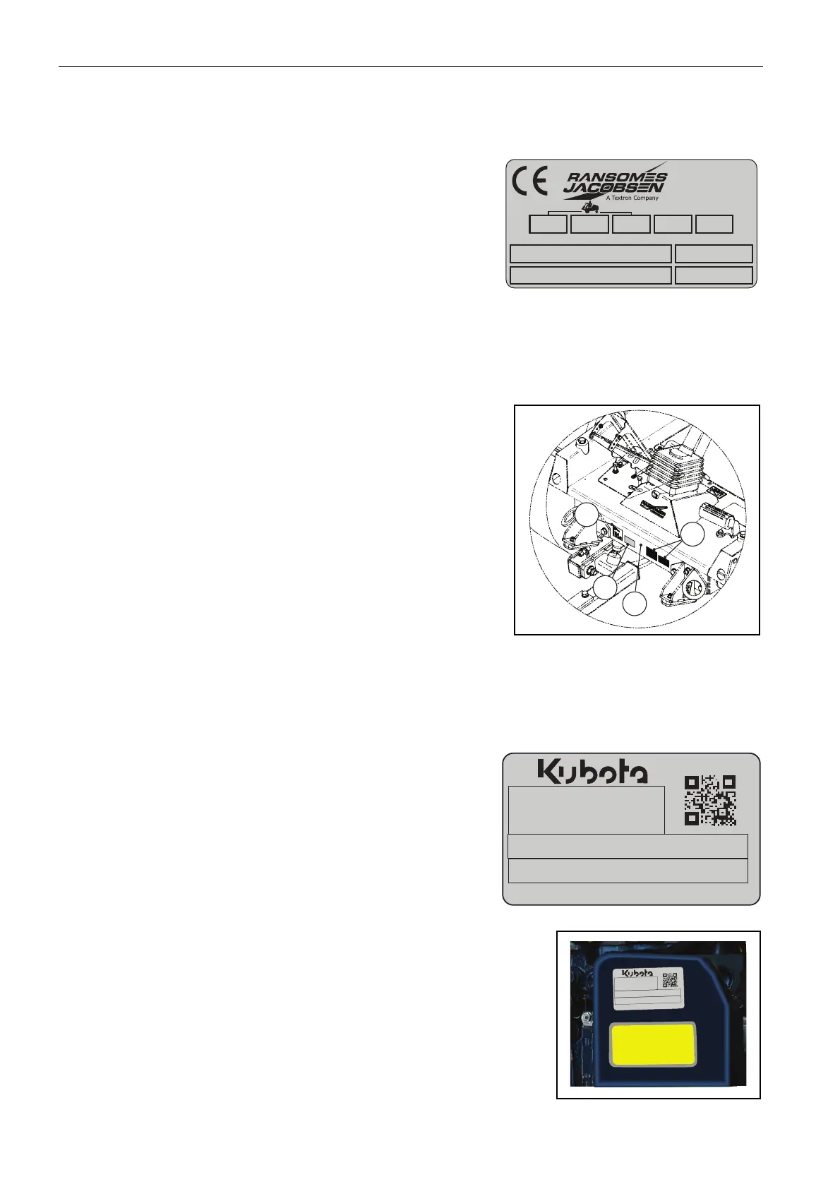 front of the mower. Label shows the engine group and serial number.