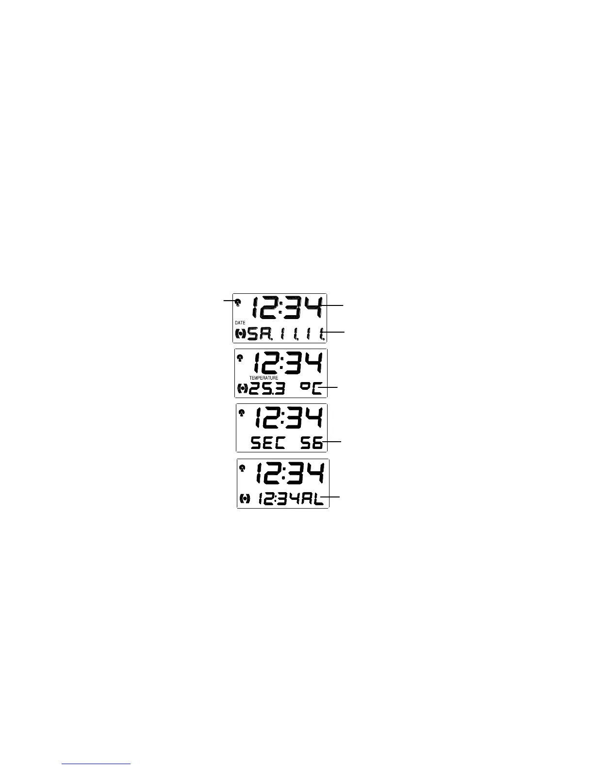 Bij het indrukken van de MODE/MIN knop wisselt het klokscherm tussen de 4 weergavestanden: