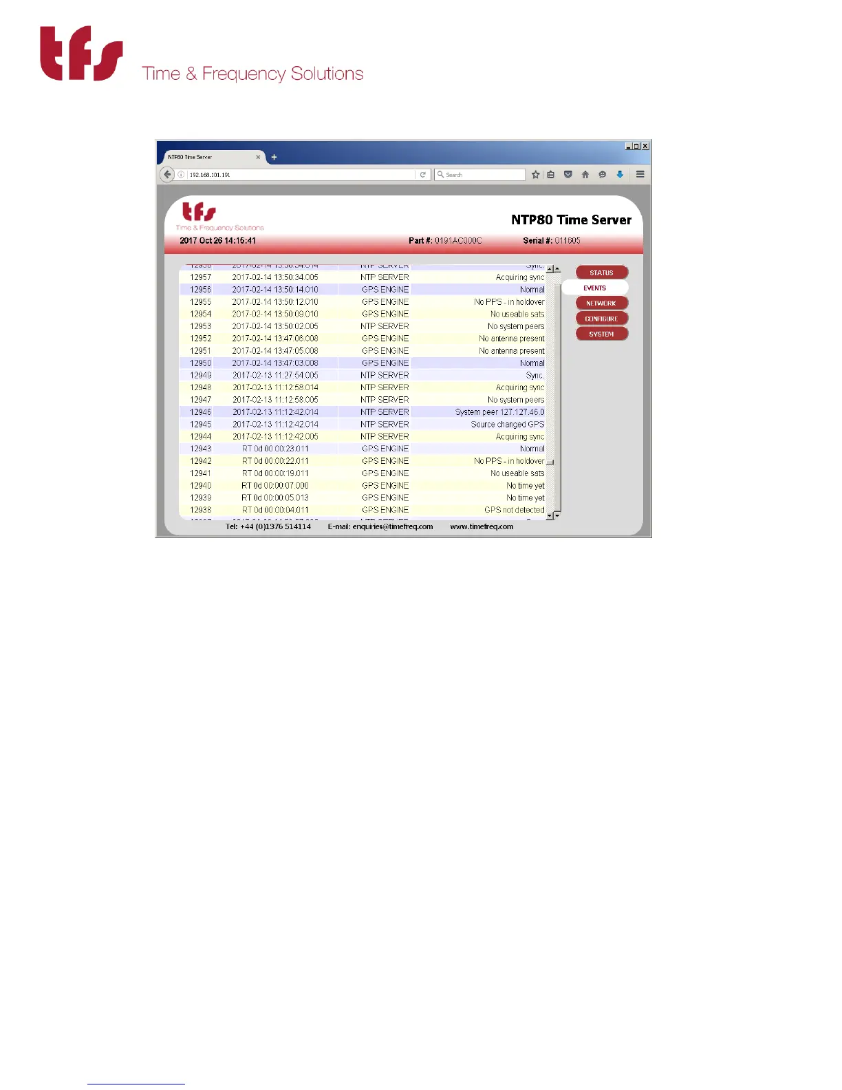 The event page shows all the recorded events from the GPS engine and NTP server parts of the