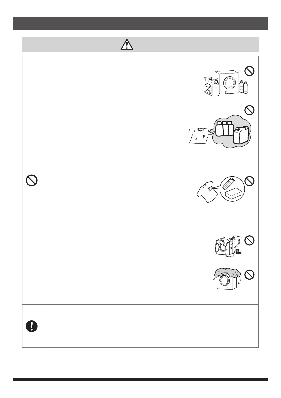 • Never dry clothes made of or stained with the following