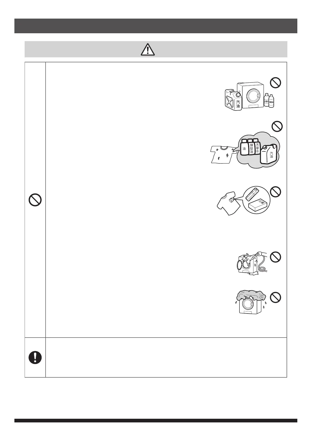 切勿用水噴灑或清洗機身及乾衣鼓內,以免引致觸電、短路及火警。