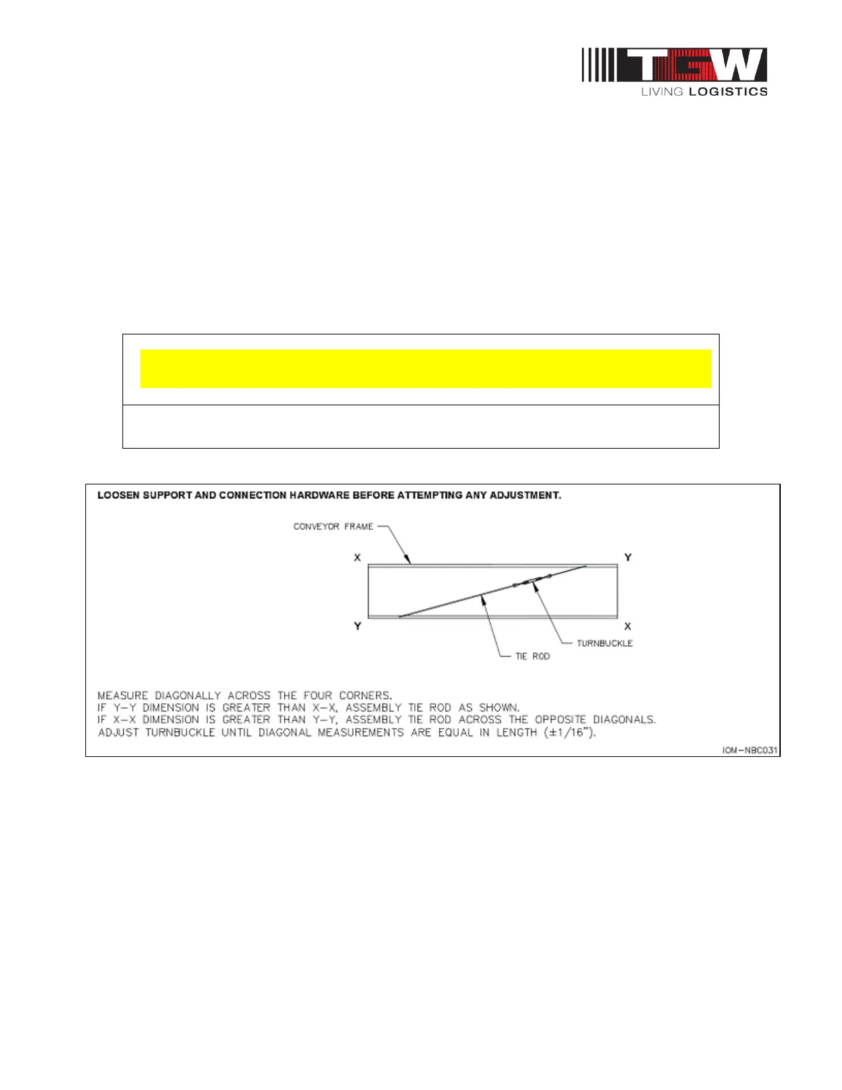 Correct the squareness of the conveyor frame by installing a tie rod along the longest diagonal