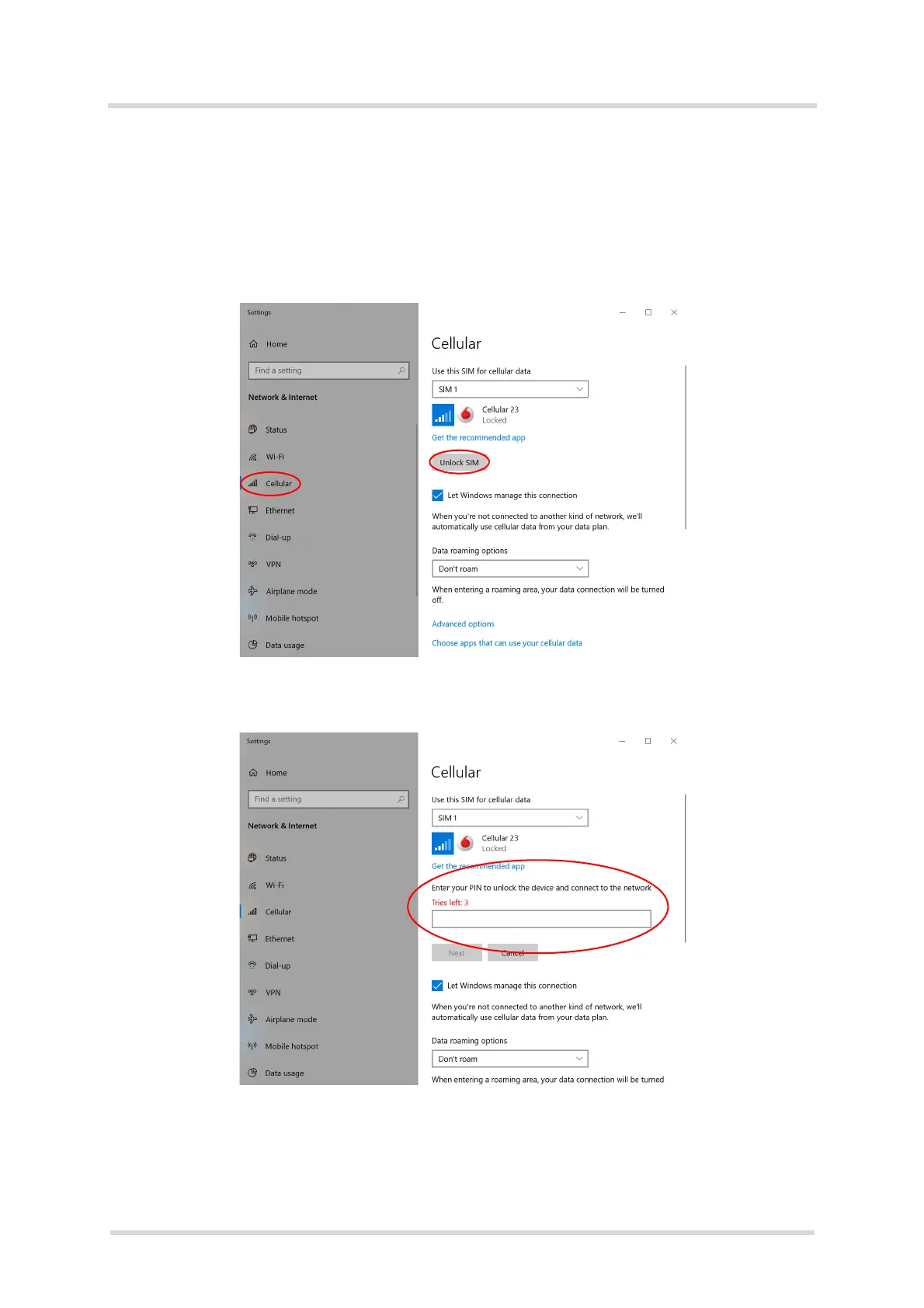 1. When the used SIM is locked by a PIN, Windows 10 will inform you, that the PIN is required.