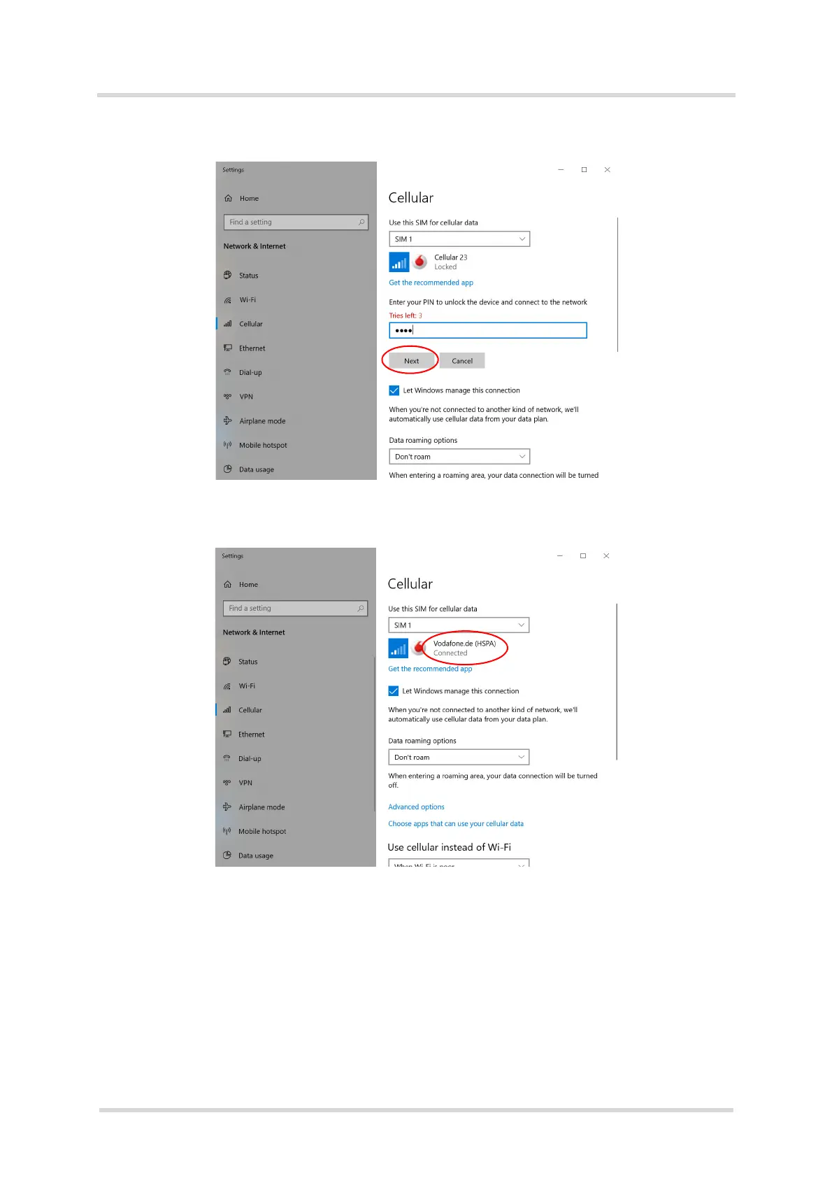 4. After successful registration to the network Windows 10 will show "Connected"