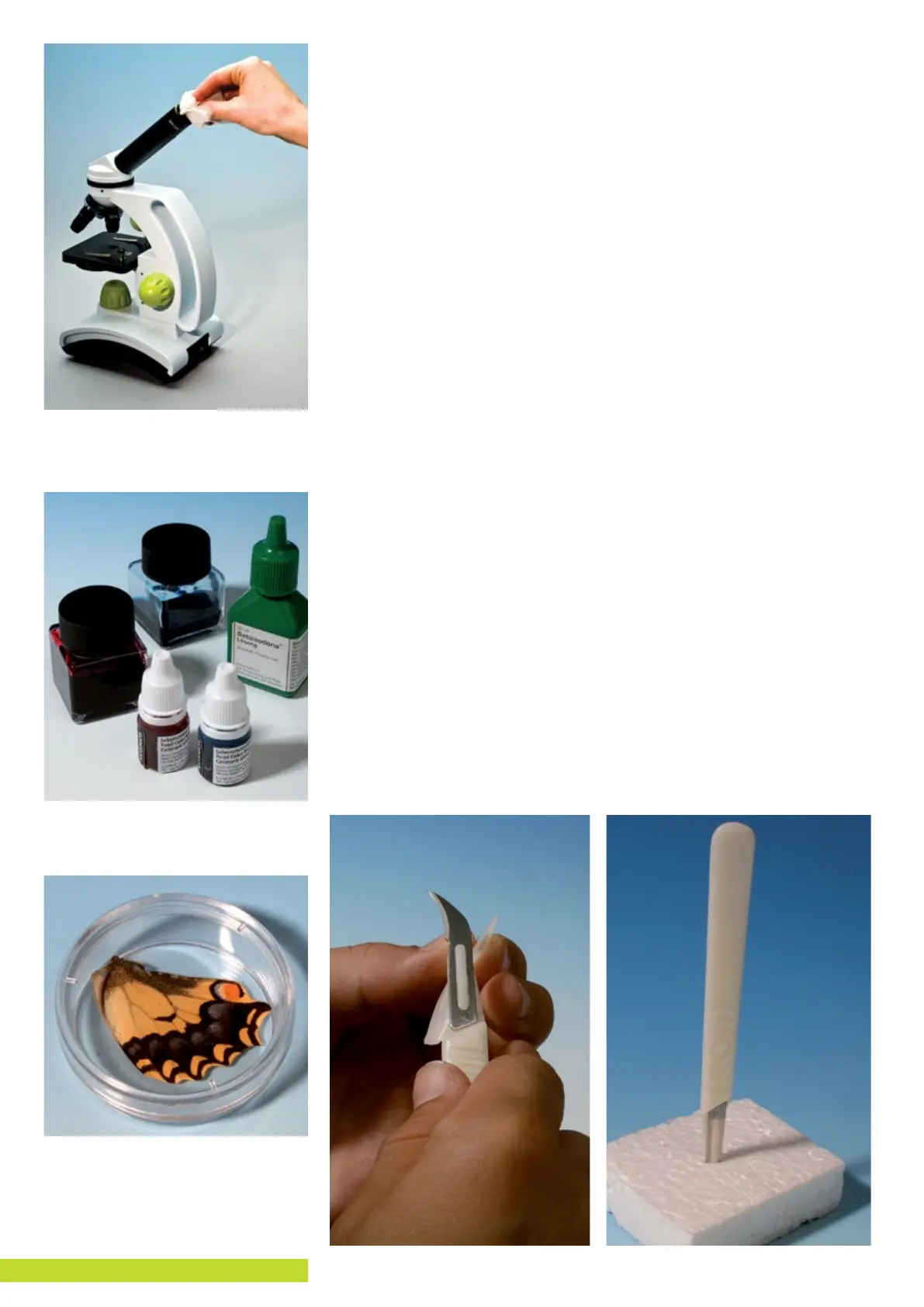 your microscope set, you will find two small bottles with staining solutions. A very