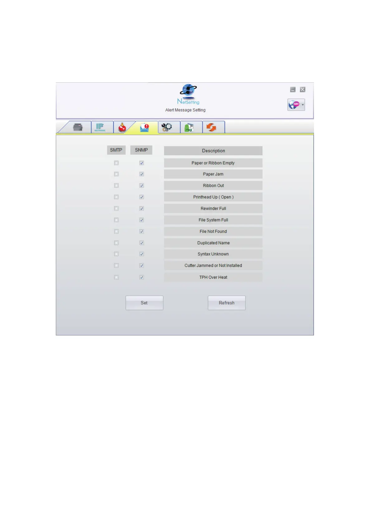 Click the “Set” button to apply the settings and the “Refresh” button to re-query the printer and refresh the values.