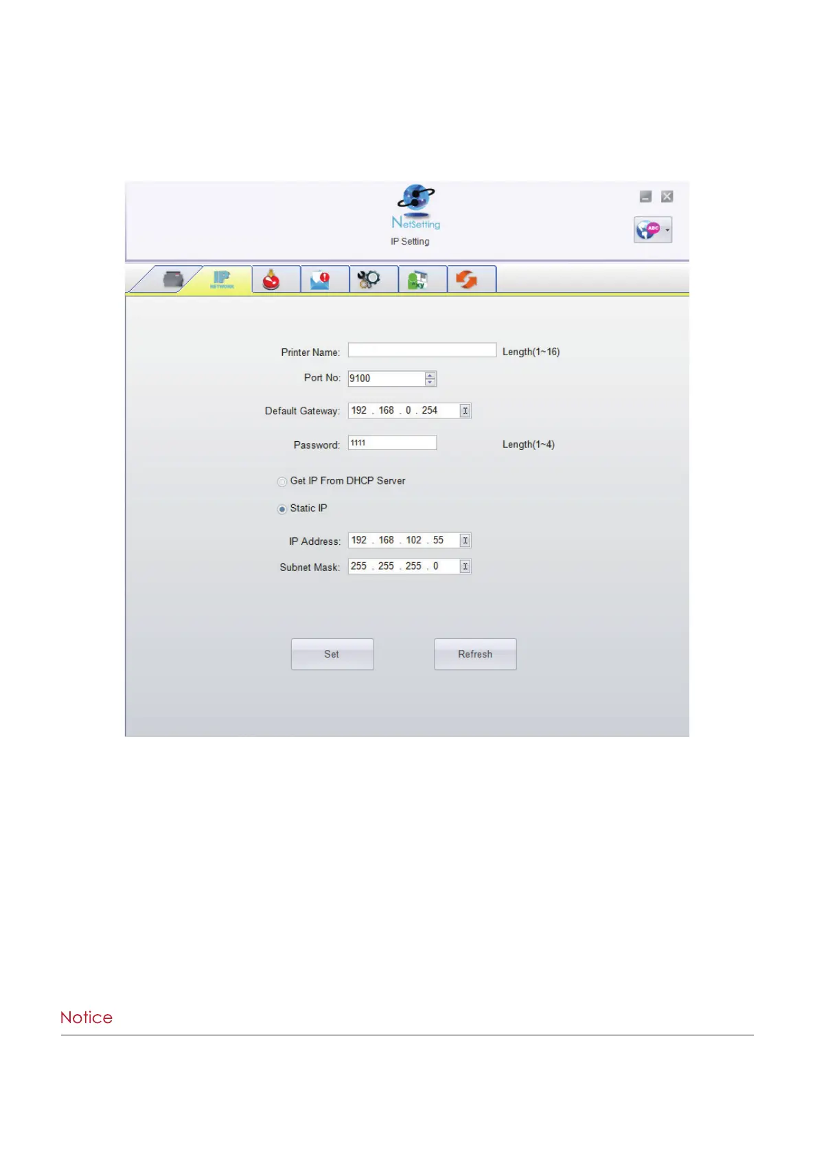 Click the “Set” button to apply the settings and the “Refresh” button to re-query the printer and refresh the values.