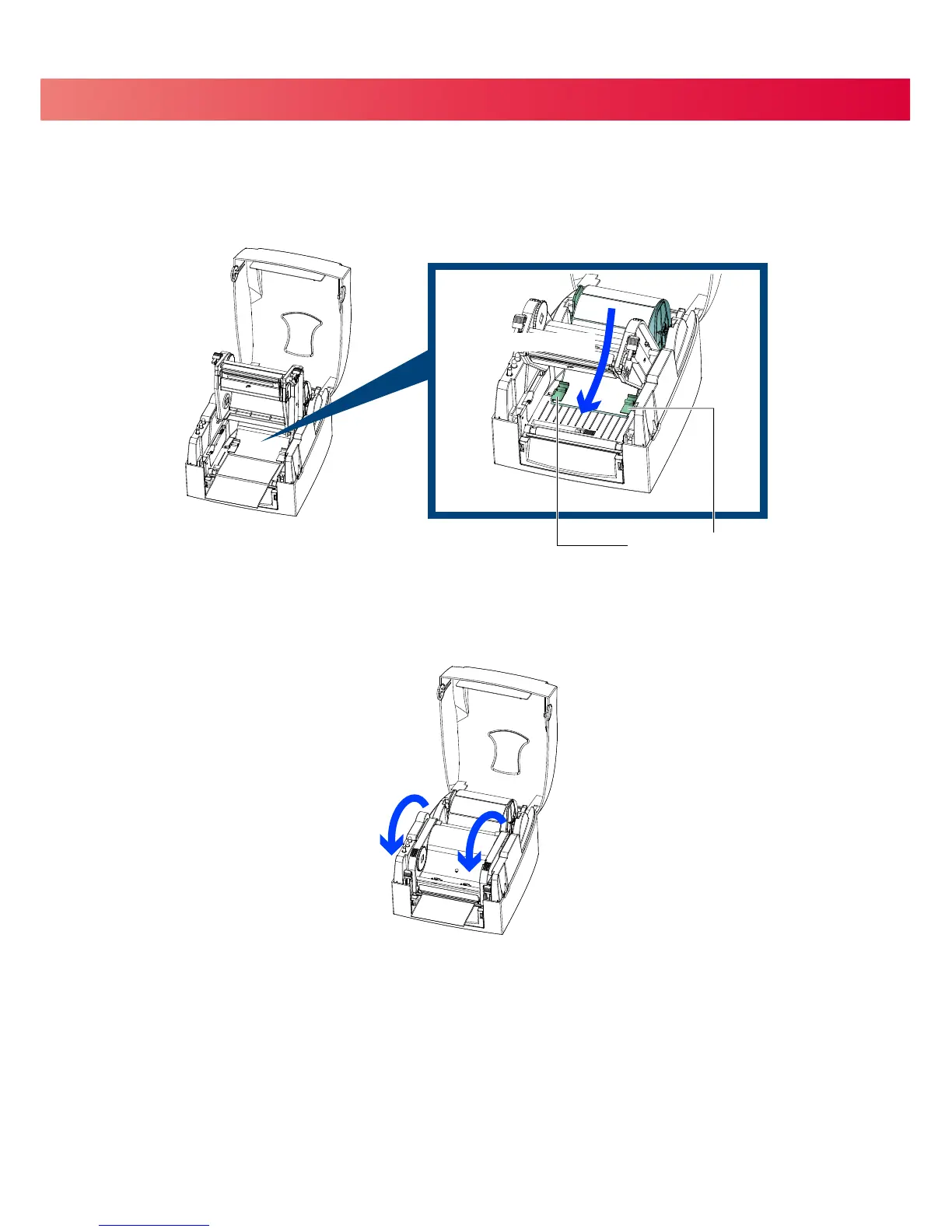 Feed the labels through the Label Guides and up to the Tear-off Plate.