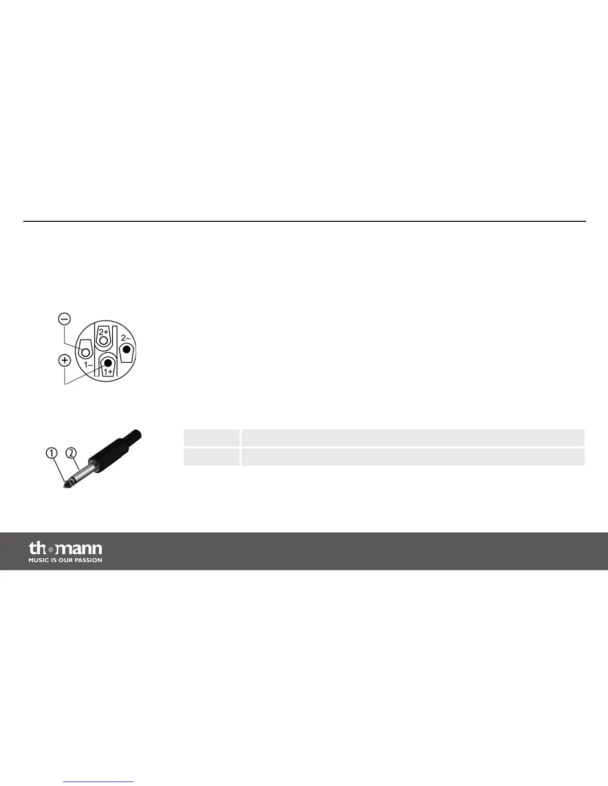 Drawing and table indicate the pin assignment of 1/4" TS phone plugs to be used.