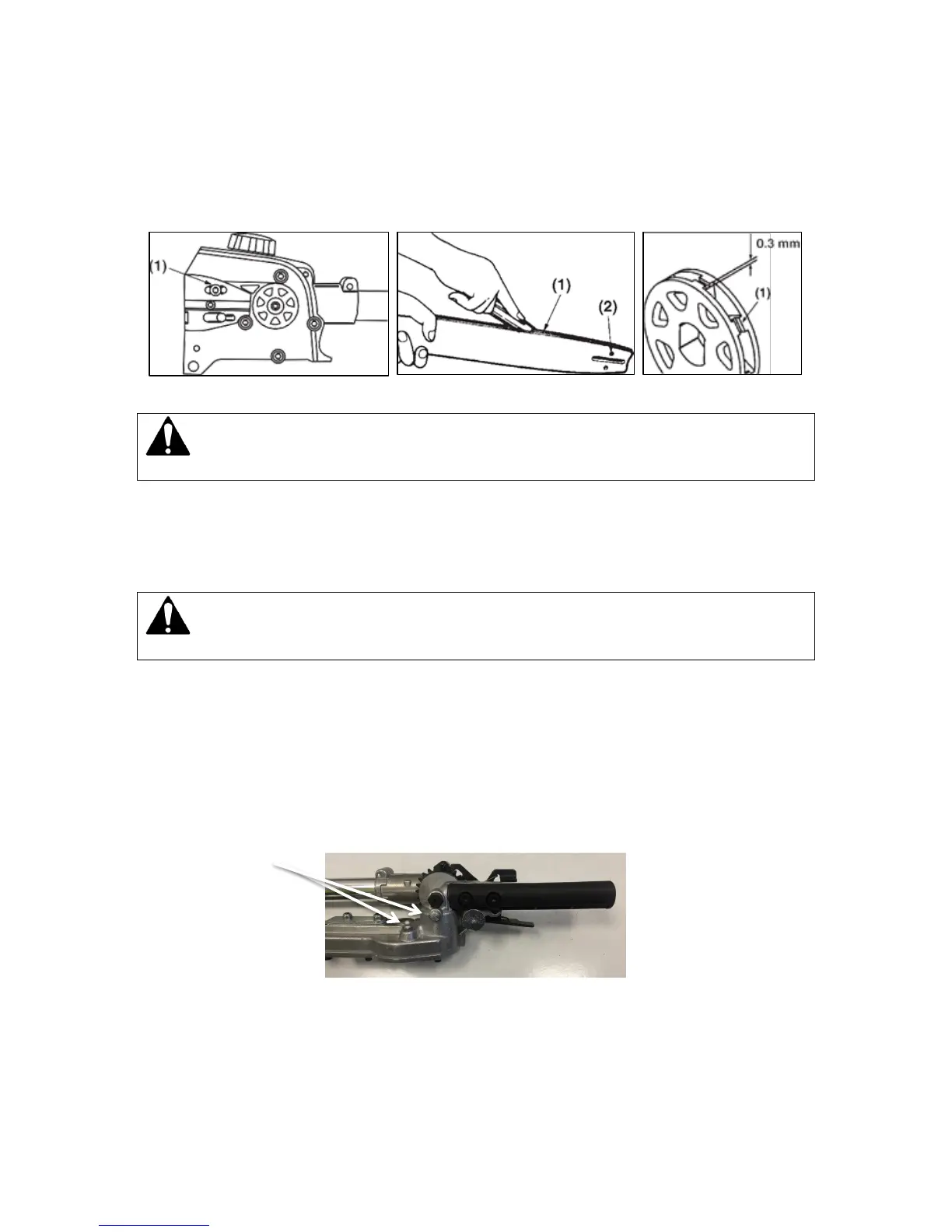 Remove sawdust in the groove of the guide bar and the oiling port. (1) Groove, (2) Oiling Port.