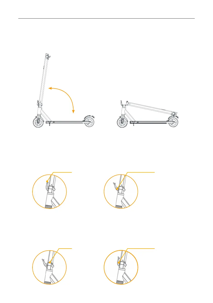 1. Premere il pedale freno per sbloccare l’asta del manubrio e sollevarla fino ad allinearsi con la chiusura di blocco.