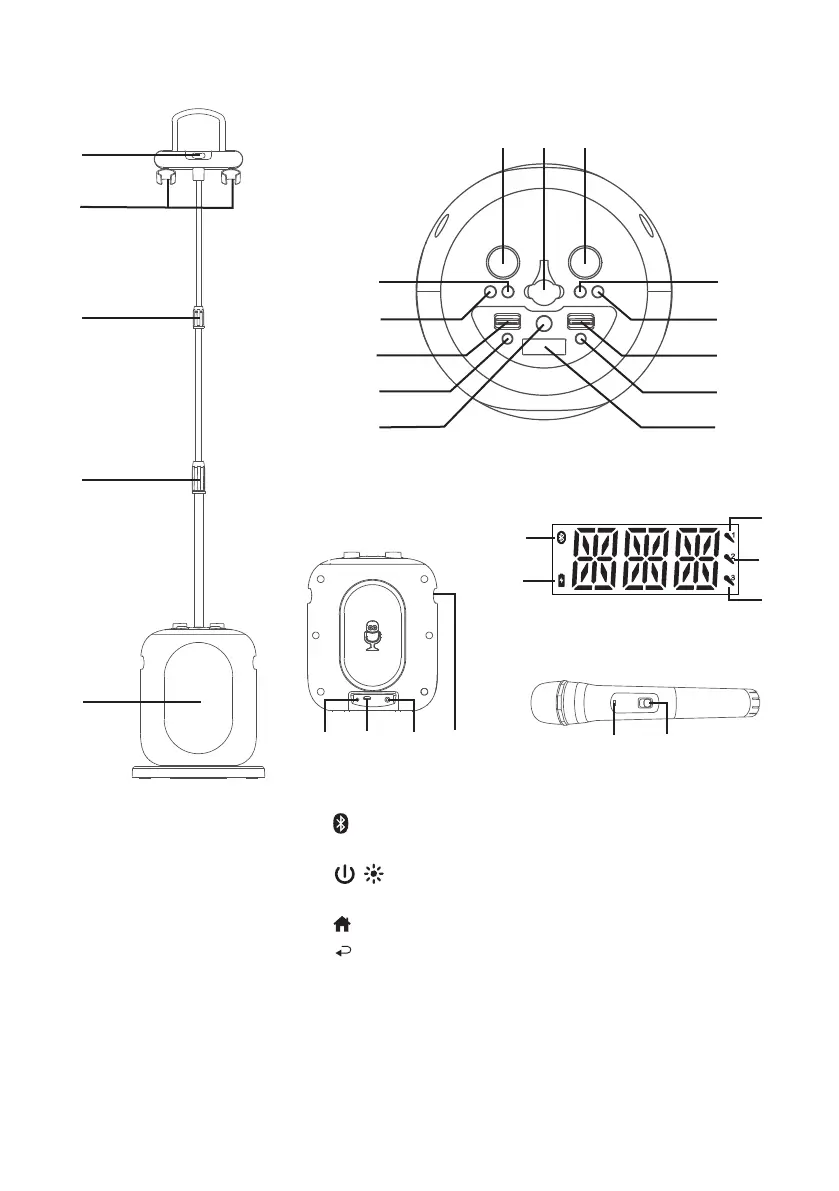 The Singing Machine SMC2040 - Location of Controls and Features; Main Unit Controls Overview; Microphone Stand Components; Display and Indicator Lights
