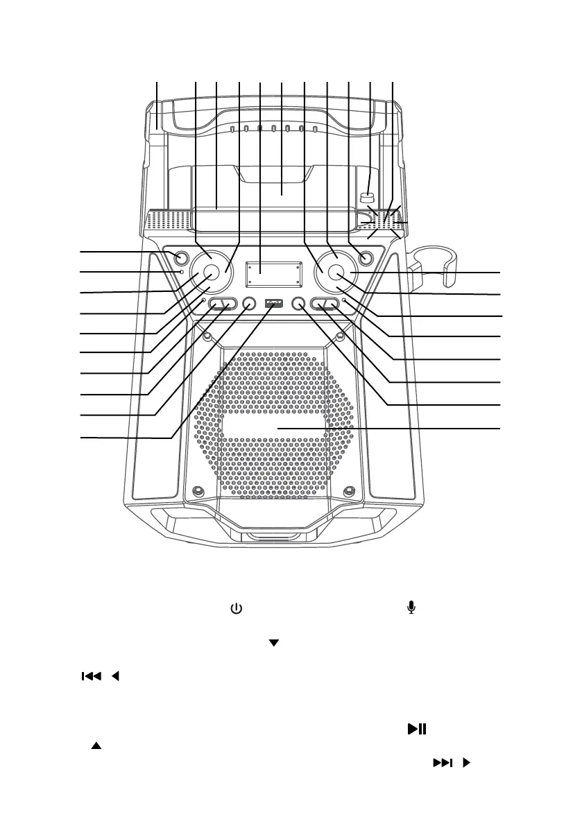 The Singing Machine SML2350 - Top and Front Control Locations; Audio and Playback Controls; Unit Interface and Mode Controls